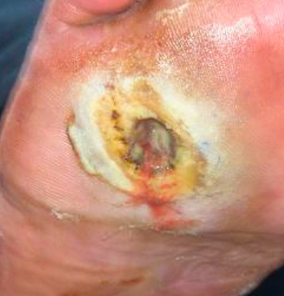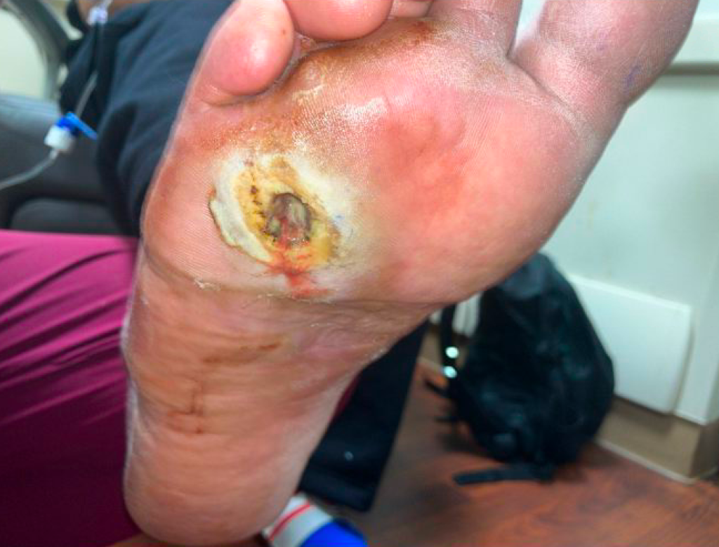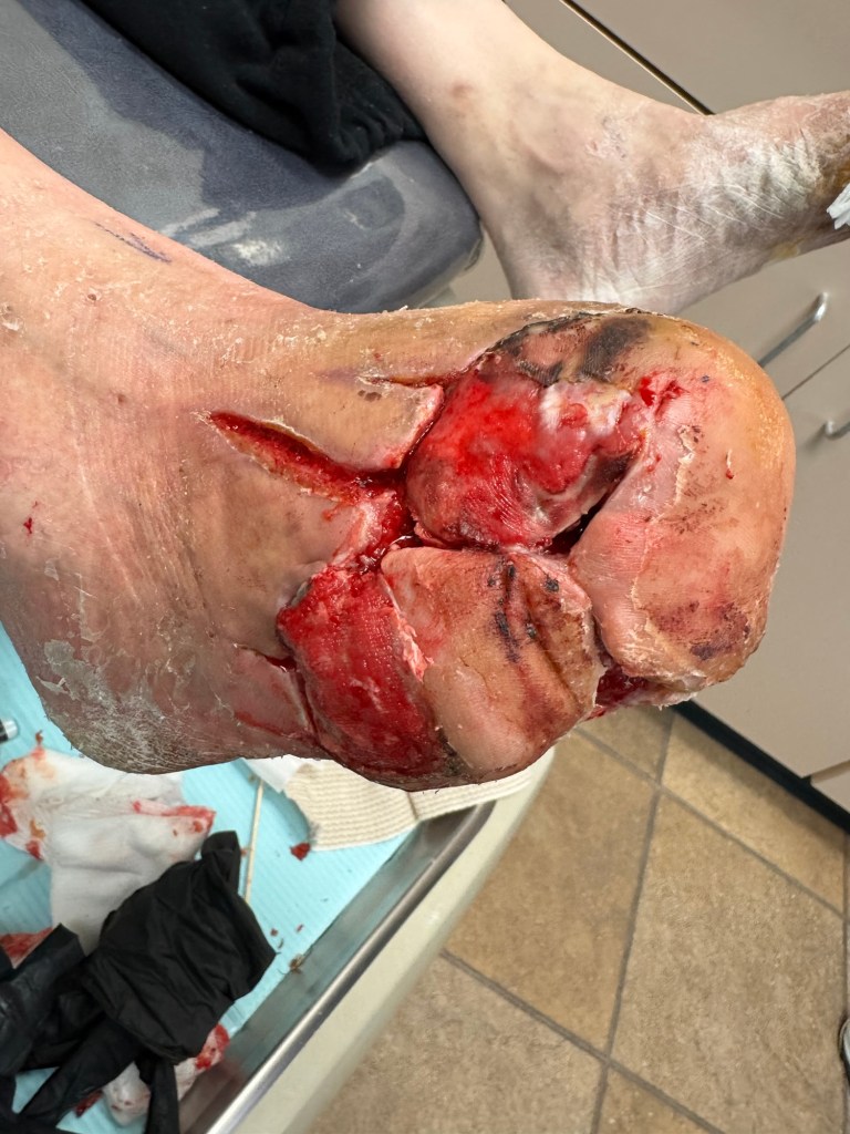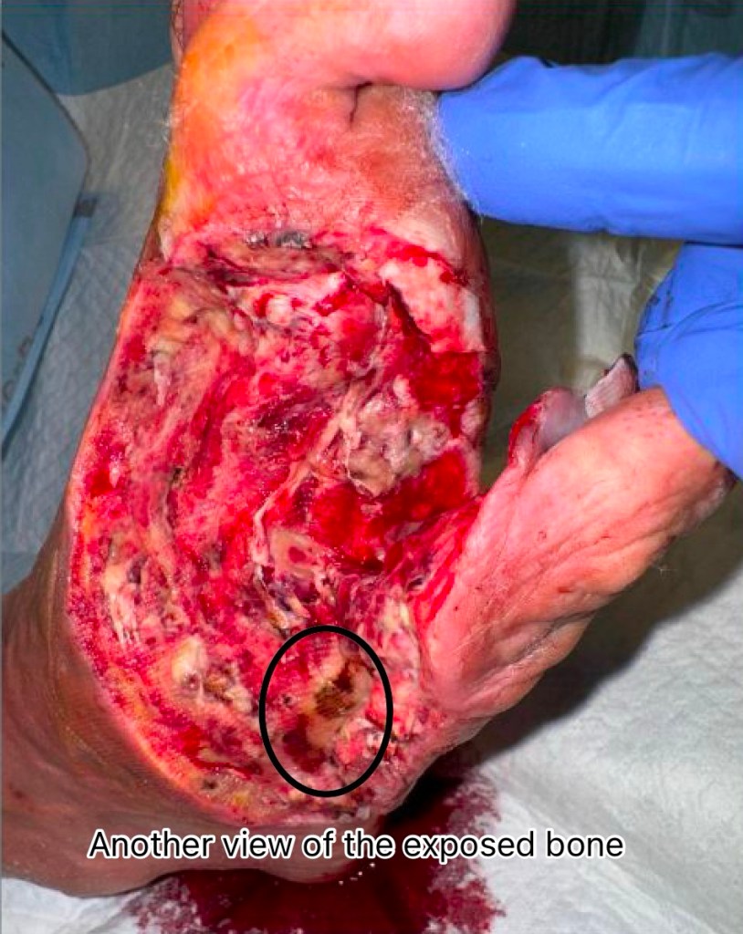 This male in his mid 50s presented to the ER, and had a diabetic foot infection. He had WBC 21, vital signs stable, had a chronic wound for several months that became infected. Here’s a photo of the bottom.