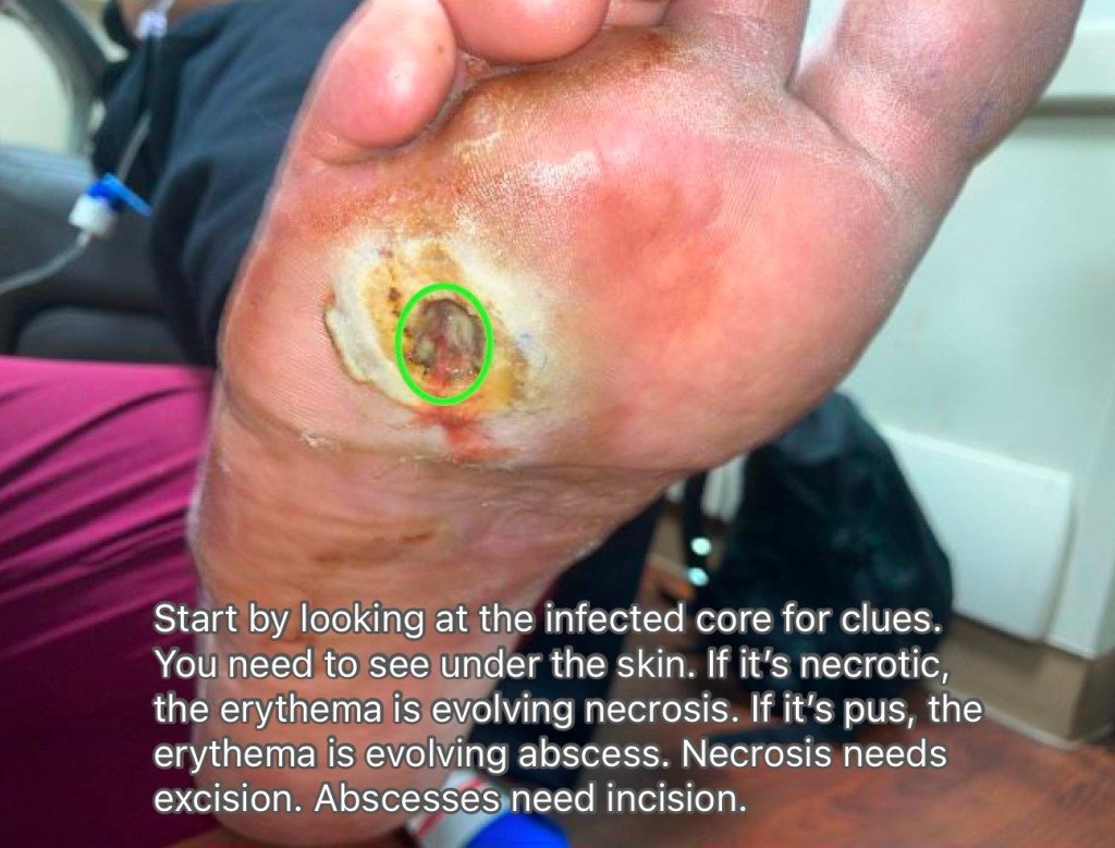 What do you see? In medical school and podiatry school, it’s normal at this stage of the work-up to request X-rays and an MRI to rule out osteomyelitis. Maybe if there’s concern about necrotizing fasciitis, we might calculate LRINEC score.