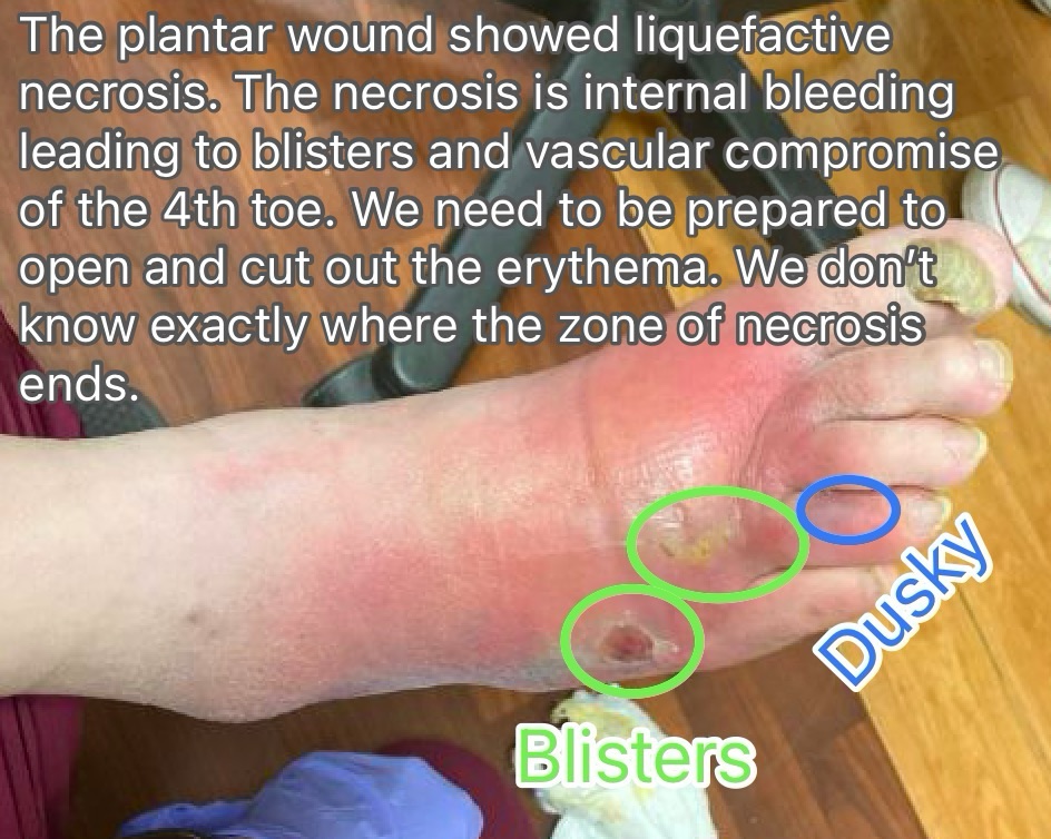 The blistered area is a big clue, it indicates end stage tissue death, the skin isn’t dead yet. Based on blister location, this needs at least a 4th ray amputation, probably a 5th ray. The erythema indicates evolving necrosis, we just don’t know how bad it is underneath, but I’m certain that the zone of necrosis is somewhere between the 4th ray, and the edge of erythma. So I have to be prepared to remove all of the erythematous skin. Patient needs to know he might not have any dorsal skin. Usually most patients don’t have a problem with a big wound, but losing toes can be difficult. In cases where I think ultimately they need a TMA, I’ll try to start with the minimum consent of a 4th ray with I&D. That gives them time to come to terms with losing more toes so I can get the consent for TMA at post-op rounds.