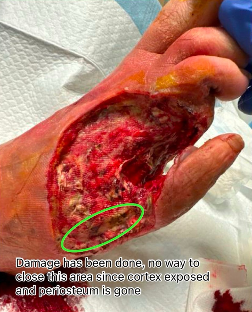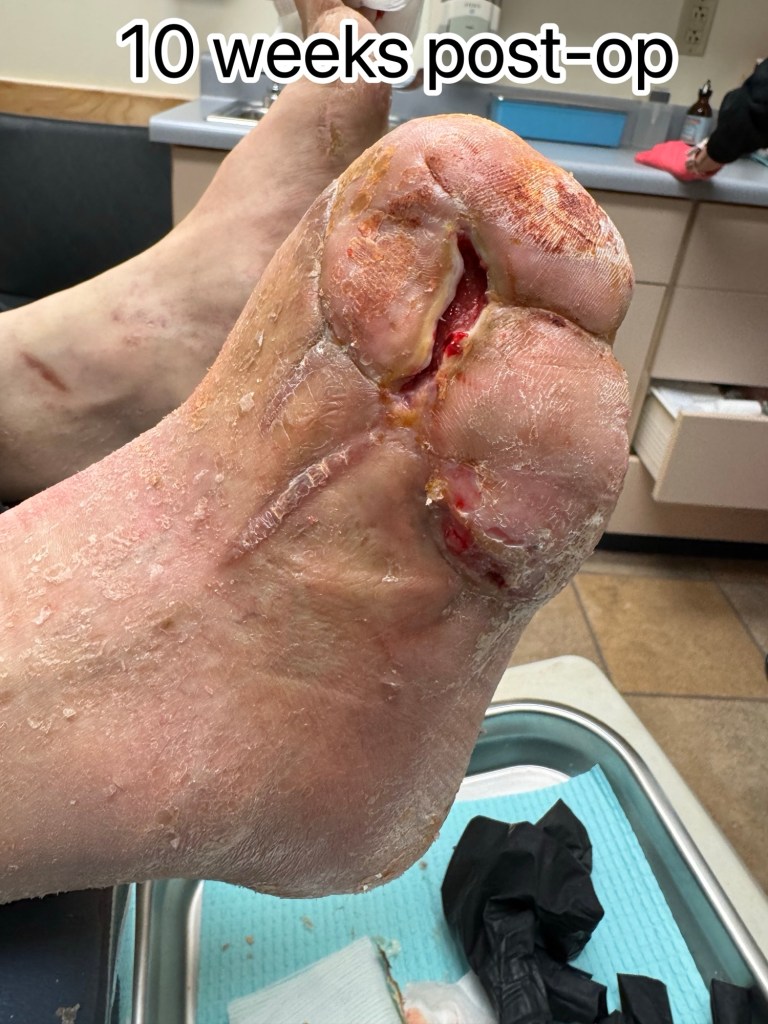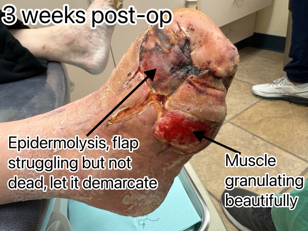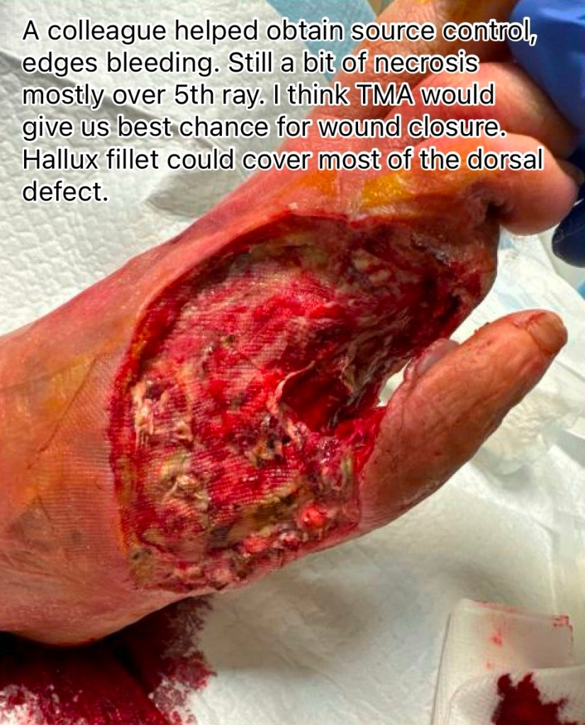 On post-op rounding, the skin edges look clean and granular. The EDL tendon stump looks a little goopy so it might need to be explored. The dorsal defect will heal fine and since it’s a NWB surface it won’t affect recovery all that much if we have to let it heal secondarily. Could also do a hallux fillet flap to cover dorsal. Mostly worried about the large 4th ray defect and 5th metatarsal bone exposed. The patient wanted to be healed as soon as possible, and so we planned for a TMA with hallux fillet flap to cover the dorsal defect.