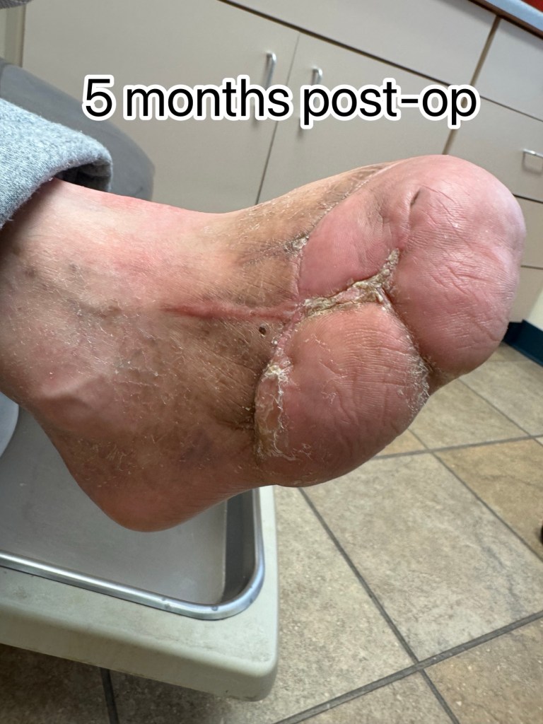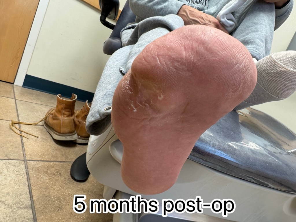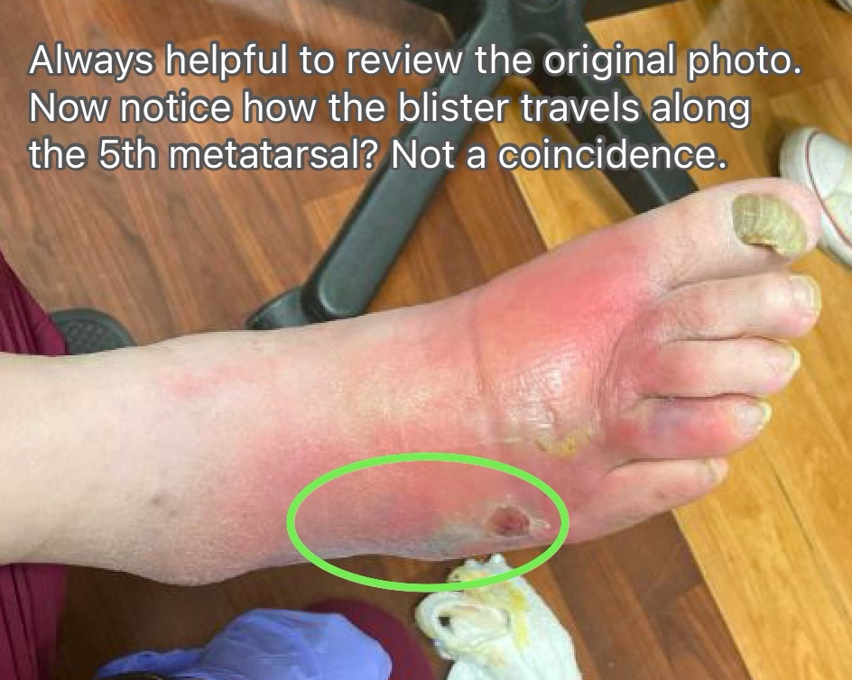 Notice that the damage to the 5th metatarsal was quite extensive. If we carefully now look back at the pre-op photos, I notice that the blister was indeed along that 5th metatarsal shaft. This is not by coincidence.