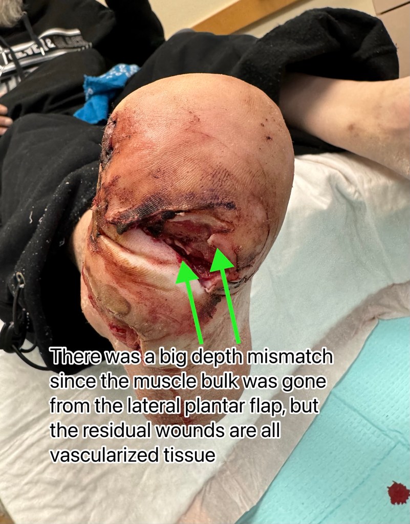 The medial plantar flap was stretched over laterally as much as possible, but due to repurposing the abductor digiti mini muscle, the lateral plantar flap had less bulk, creating a depth mismatch. However I’m not worried about that residual plantar wound, it’ll heal fine since we got all the bones covered. Same with the exploratory incisions, since there was a tiny bit of pus, decided to leave them open just incase. You’ll see this will heal just fine with minimal effort.