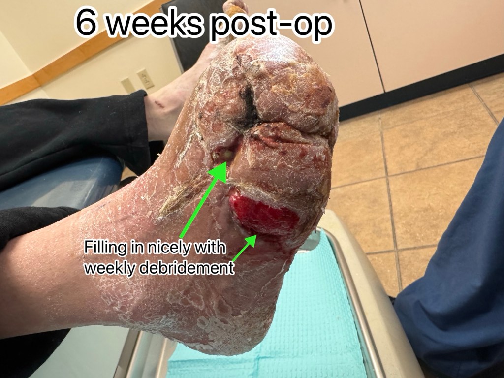 I’ll admit that prior to 2025, I was not comfortable doing muscle flaps, and I didn’t push myself to think that I needed to do it because I was able to get wounds with exposed bone to heal with corticotomies and scaffold grafts. However, the result is literally skin and bone… very difficult to sustain the test of time with patients needing to walk on that surface. It might be okay for a very low level ambulator, but for someone active like this patient, soft tissue bulk is needed over bone. Plus once I learned the dissection technique, it wasn’t technically very difficult to perform.